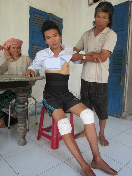Ngày 15/2, hơn tuần lễ sau khi xảy ra sự việc, thanh niên này vẫn đang được gia đình chăm sóc trong tình trạng quấn băng nhiều bộ phận trên cơ thể. Anh chập chững vịn bước ra bàn tiếp chuyện: “Đúng ra phải nhập viện nhưng do đông bệnh nhân quá nên gia đình xin bác sĩ cho về nhà tự điều trị. Khắp mình mẩy vẫn đau nhức lắm anh ơi, không biết cột sống lưng có bị tổn thương gì không nữa”, vừa nói Anh vừa kéo áo để lộ phần lưng thâm tím.