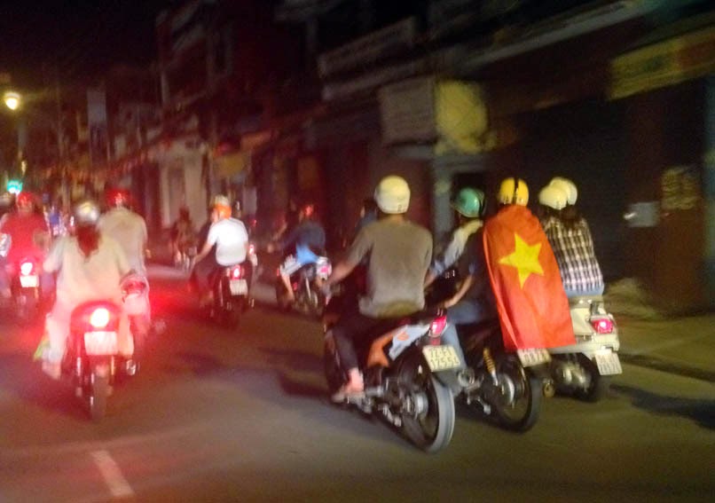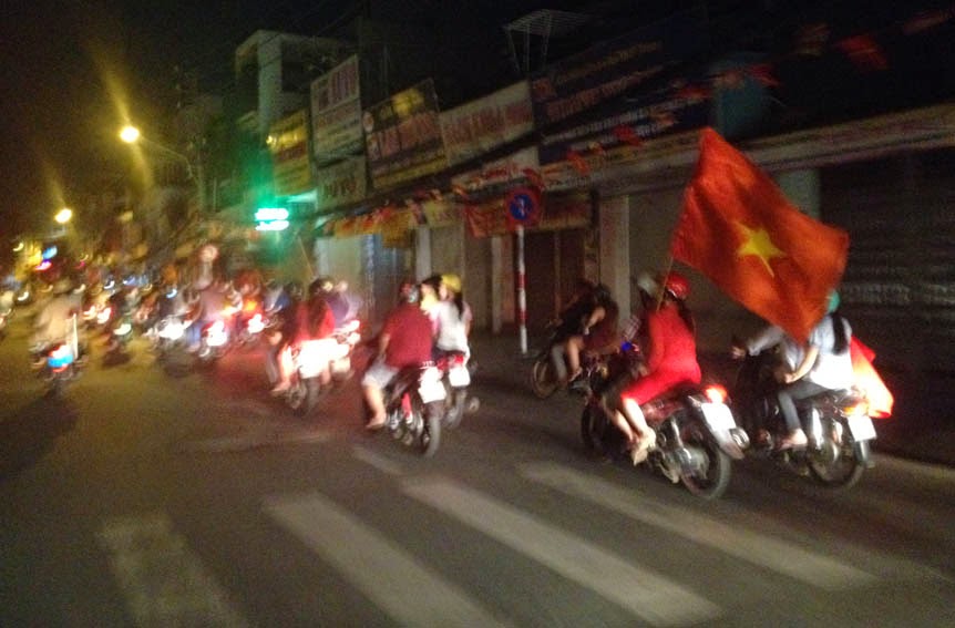 Tại Sài Gòn, theo CTV Danlambao tại hiện trường, đến 12 giờ khuya tại ngã tư Bảy Hiền (Q. Tân Bình) vẫn còn khoảng 100 thanh niên đi xe máy với cờ đỏ sao vàng chạy về hướng Lạc Long Quân thỉnh thoảng cùng nhau hô to khẩu hiệu "Việt Nam muôn năm!". Cảnh sát giao thông, 113 chốt chặn tại các ngã tư và chạy theo đoàn người biểu tình và không ngăn chặn.
