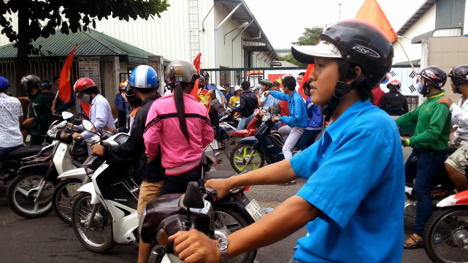 Gần giữa trưa, nắng tháng 5 gắt và khó chịu vô cùng, ai cũng tìm chỗ mát để né. Vậy mà chỉ đi được một đoạn, chúng tôi tìm thấy hàng loạt các xe gắn máy cầm cờ, trống…v.v gầm rú phía trước. Trong các nhóm ào ạt đi như vậy, có đủ nữ lẫn nam. Cứ thỉnh thoảng lại nghe tiếng hô “Việt Nam Muôn Năm”, “Đả đảo Trung Quốc”... như một cách làm hiệu để đoàn không bị lạc hướng. Dự đoán các nhóm này sẽ đi về khu công nghiệp ở Sóng Thần, Bình Dương, nên chúng tôi quyết định bám theo.